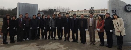 ▲ 지난 23일 정읍 감곡면 출신 재경 기업가 김호석 (주)대일개발 회장이 사비를 들여 새롭게 신축한 정읍 감곡중 교문 앞에서 교직원·동문 등 관계자들이 기념촬영을 하고 있다.