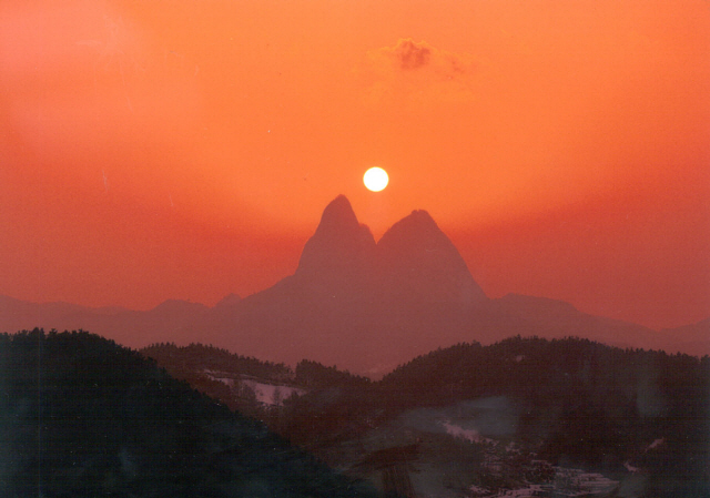 ▲ 진안군은 을미년 새해 첫날 마이산이 가깝게 보이는 마이산휴게소전망대에서 희망찬 새 출발을 기원하는 ‘2015년 청양의 해, 진안고원 해맞이 행사’를 개최할 예정이다. 사진은 진안 마이산 일출 장면. 전북일보 자료사진