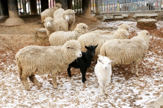 ▲ 전주동물원 양 우리에 살고 있는 양 가족. 염소 두 마리가 마치 원래부터 거기 있었던 것처럼 자연스럽게 양 무리에 들어가 있다.