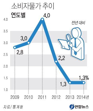 지난달 31일 통계청이 발표한 2014년 연간 소비자물가 동향에 따르면 지난해 소비자물가는 작년보다 1.3% 올랐다. 지난 2011년 4.0%이던 물가상승률은 2012년 2.2%, 2013년 1.3%로 둔화했으며 지난해는 2013년과 같은 수준의 상승률을 보였다.