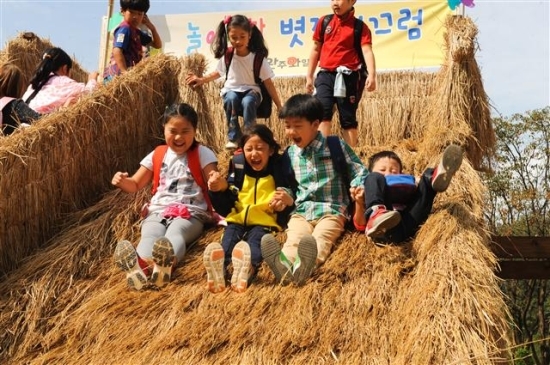 ▲ 완주 와일드푸드 축제를 찾은 아이들이 볏짚으로 만든 미끄럼틀을 타며 즐거워 하고 있다. 사진제공=완주군