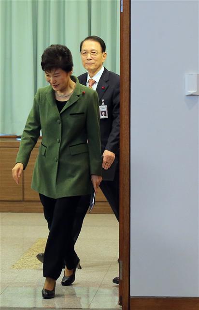 ▲ 박근혜 대통령이 6일 오전 청와대 위민관 영상국무회의실에서 열린 청와대·세종청사 간 국무회의에 김기춘 비서실장과 함께 입장하고 있다. 연합뉴스