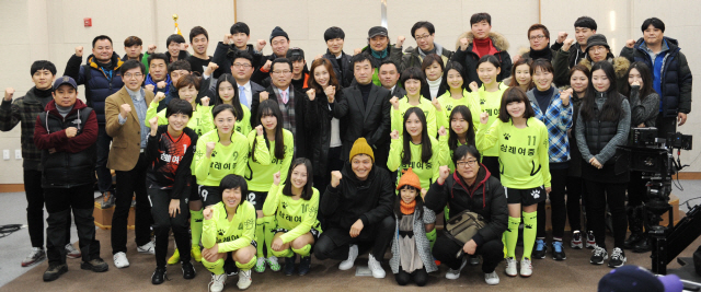 ▲ 전교생 250명, 선수 12명에 불과한 삼례여중 축구부의 이야기를 다룬 영화 ‘슈팅걸스(감독 배효민)’가 7일 완주군청에서 제작발표회를 열고, 본격적인 촬영에 들어갔다. 정웅인, 윤주희 등이 주연을 맡은 슈팅걸스는 8월 개봉을 목표로 삼례여중을 비롯한 완주군 지역에서 촬영이 진행될 예정이다. 사진제공=완주군