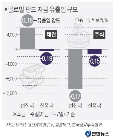 11일 금융투자업계와 글로벌 펀드평가사 EPFR에 따르면 지난 1∼7일 선진국 채권형 펀드는 57억3000만 달러 순유입을 나타냈다. 반면 신흥국 채권형 펀드는 4억7000만 달러가 순유출해 ‘5주 연속 순유출’을 기록했다.
