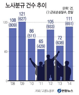 18일 고용노동부에 따르면 작년의 노사분규 건수는 모두 111건으로 전년보다 39건(54.2%) 늘었다.