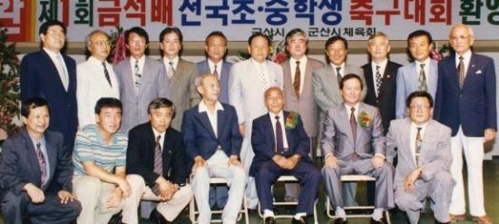 ▲ 제1회 금석배 축구대회 환영식 사진. 앞줄 의자에 앉은 사람 중 가운데가 고 채금석 선생이다. 그 왼쪽은 고판남 전 국회의원, 오른쪽은 강현욱 지사. 강지사의 뒷줄에는 최공엽 전북축구협회장이 있고, 그 왼쪽에는 이건재 군산시장, 오른쪽에는 김철규 도의회 의장이 있다.