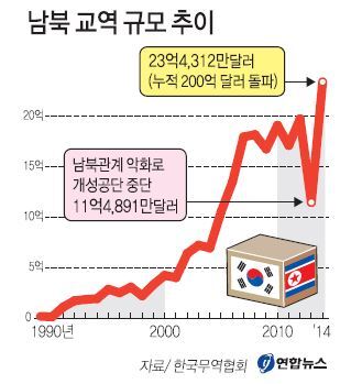 남북교역 규모는 개성공단이 본격적으로 가동된 2005년부터 연간 10억 달러를 넘어서며 본격적으로 늘기 시작해 2012년 19억7621만 달러로 20억 달러에 육박했다. 뉴스