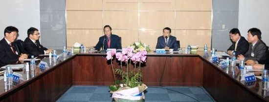 ▲ 첨단방사선연구소 전략산업 현장간담회에 참석한 송하진 도지사와 김생기 정읍시장이 특구지정에 대한 의견을 나누고 있다.