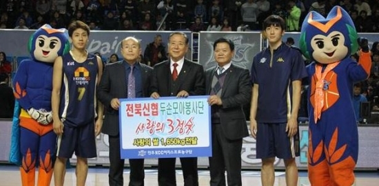 전북신협 두손모아봉사단은 1일 ‘2014-2015년 프로농구 KCC 전반기 경기’에서 모두 165개 사랑의 3점슛 성공에 따라 모두 1650㎏의 사랑의 쌀을 전달했다고 밝혔다.