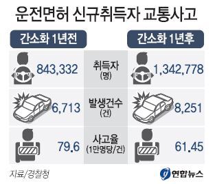 5일 경찰청에 따르면 2011년 6월 운전면허시험 간소화 후 1년간 운전면허 신규 취득자의 1만명당 교통사고 건수(사고율)는 61.45건으로 간소화 이전 1년간 신규 취득자의 사고율인 79.6건보다 22.8%나 감소했다.