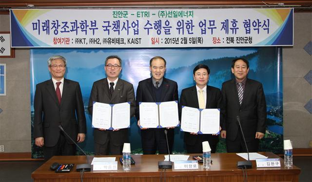 ▲ 진안군이 지난 5일 한국전자통신 연구원·(주)선일에너지와 업무 협약식을 열고 있다.