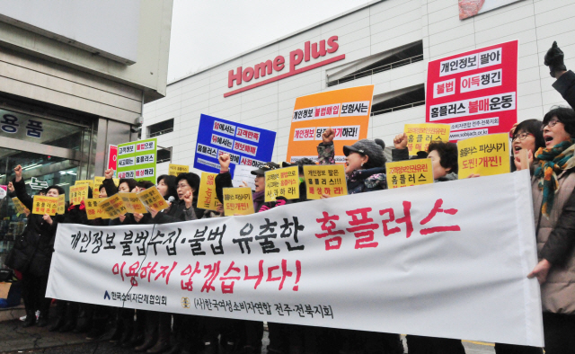 한국여성소비자연합 전주전북지회 회원들이 16일 전주 홈플러스 효자점 앞에서 개인정보를 불법매매한 홈플러스를 규탄하는 불매운동 선포 기자회견을 하고 있다.