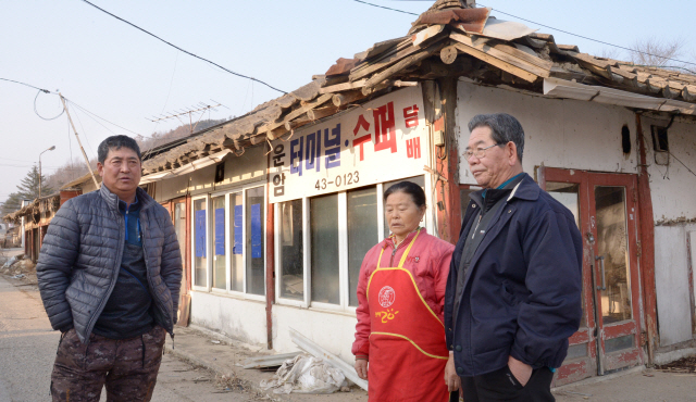 정든 보금자리에서 마지막 설 명절을 맞는 임실 운암면 쌍암리 주민들이 옛 운암터미널 앞에서 착잡한 표정으로 대화를 나누고 있다.
