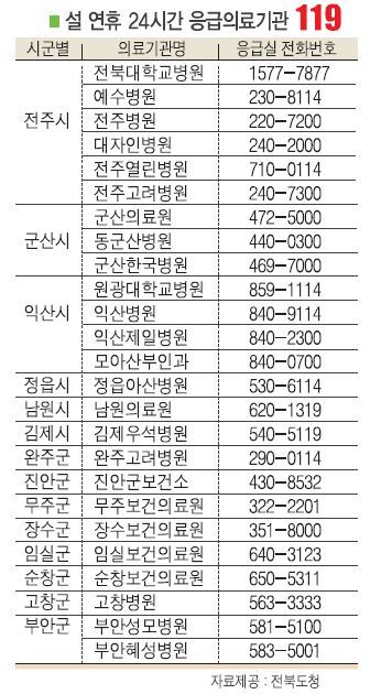 16일 전북도에 따르면 이번 설 연휴 동안 도내에서는 권역 및 전문의료센터·지역응급의료센터·지역응급의료기관·응급의료시설·종합병원응급실·보건소에서 24시간 진료를 실시한다.