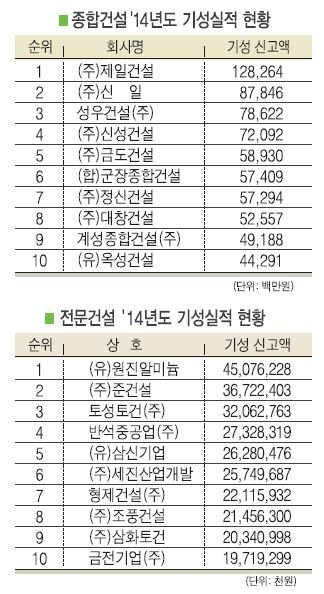 지난해 건설공사 기성실적 발표 / '종합' 기성액 2.7% 감소…'제일' 2년 연속 1위 / '전문'은 3.2% 증가…'원진알미늄' 첫 1위 등극