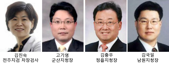 지난 17일 발표된 이번 인사에서 전주지검 군산지청장에는 고기영(50·사법연수원 23기) 제주지검 차장검사, 정읍지청장에는 김충우(48·사법연수원 24기) 광주지검 부장검사, 남원지청장에는 김국일(47·사법연수원 24기) 수원지검 형사2부장검사가 각각 전보됐다.