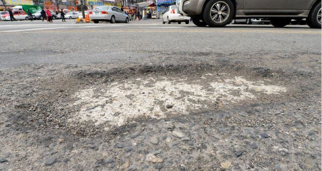 해빙기를 맞아 ‘포트홀’(도로 파임 현상)이 증가하고 있는 가운데 25일 전주 모래내시장 인근 도로에 생긴 포트홀이 운전자들의 안전운행을 위협하고 있다.