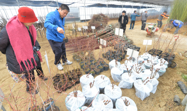 26일 산림조합중앙회 전북본부 나무시장이 완주군 용진면 용진중학교 뒤 수목원에서 개장한 가운데 시민들이 우량품종의 수목을 사기 위해 살펴보고 있다. 용진 나무시장은 최근 온난화로 나무 심는 시기가 빨라져 보름 일찍 개장했다.