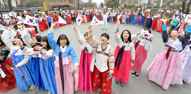 제96주년 3·1절을 맞아 전주 한옥마을에 한복데이 기획단을 비롯, SNS를 통해 모인 관광객들이 고운 한복을 차려 입고 태극기를 흔들며 ‘대한 독립 만세’를 외치는 플래시몹을 하고 있다.