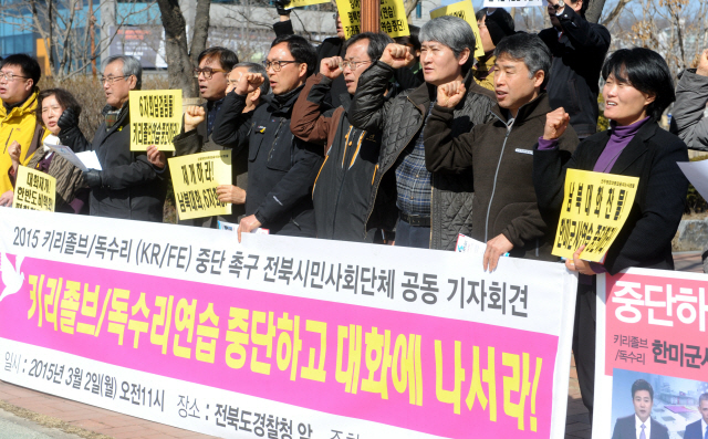 이들 단체는 이날 전북지방경찰청 앞에서 기자회견을 열고 “남북 정상회담까지 거론되던 분위기가 한미 키리졸브·독수리 연습으로 교착상태에 빠졌다”며 “한반도 전쟁위기를 고조시키고 남북관계를 악화시킬 가능성이 있는 군사훈련을 중단해야 한다”고 주장했다.