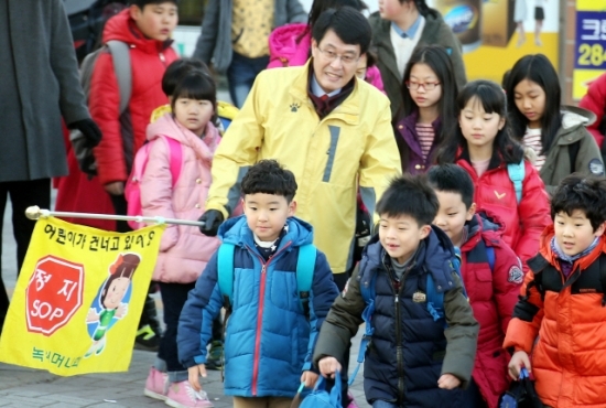 김광수 전라북도의회 의장이 2일 전주 평화초등학교 앞 횡단보도에서 아이들의 안전한 등교를 위해을 갖고 있다. 사진제공=전북도의회