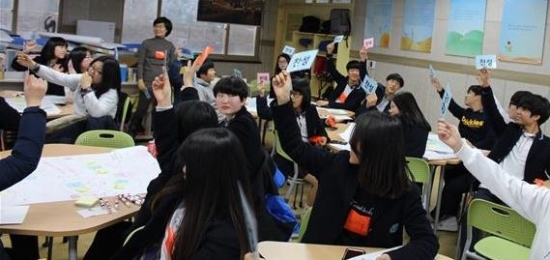 ▲ 완주군교육통합지원센터가 지난 6일 구이중학교 학생 33명을 대상으로 실시한 리더십 캠프에 참여한 학생들이 민주카드를 활용하고 있다.