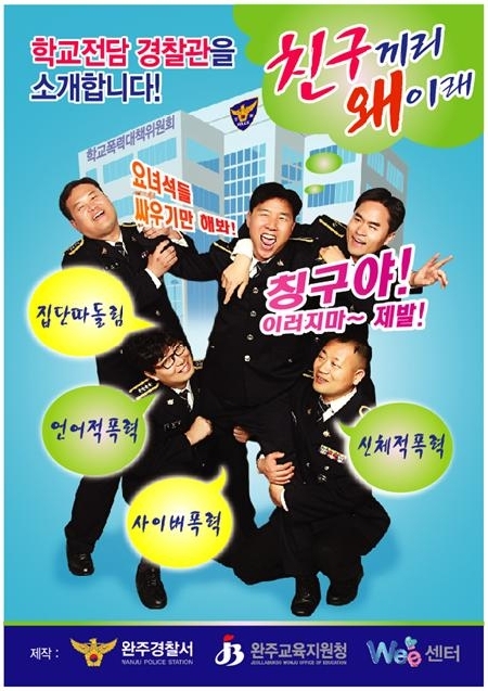 학교폭력 예방 홍보포스터는 드라마 ‘가족끼리 왜이래’를 ‘친구끼리 왜이래’로 패러디해서 제작해 학생들의 눈길을 끌고 있다. 홍보포스터에는 학교전담 경찰관의 사진과 담당학교 전화번호가 기재가 되어 있어 학교폭력과 관련 언제든지 상담할 수 있도록 했다.