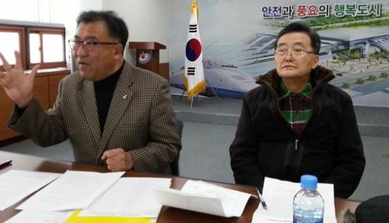 ▲ 정읍 동학농민혁명계승사업회 이갑상 이사장(왼쪽)과 최명언 유족회장이 9일 정읍시청에서 기자회견을 갖고 국가기념일 제정을 재추진할 것을 촉구하고 있다.