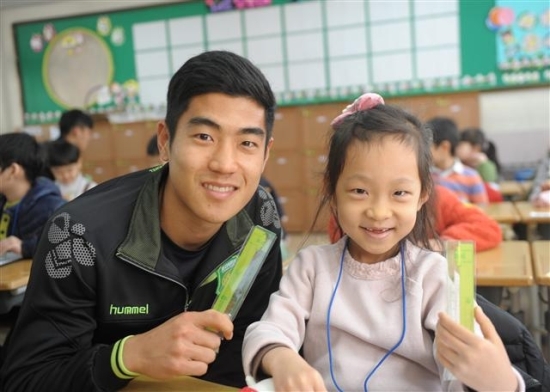 ▲ 전북현대 이주용 선수가 한 초등학교 신입생과 자를 들어보이고 있다.