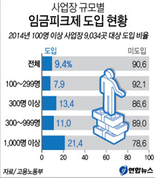 고용노동부는 2014년도 임금결정 현황조사 대상인 종업원 100명 이상 사업장 9034곳을 대상으로 임금피크제 도입 현황을 조사한 결과 9.4%(849곳)만 임금피크제를 도입했다고 19일 밝혔다.