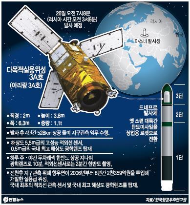 25일 미래창조과학부와 한국항공주우연구원(원장 조광래, 이하 항우연)에 따르면 아리랑 3A호는 현재 러시아 모스크바 동남쪽 1800㎞ 야스니 발사장의 지하 발사대(사일로)에서 드네프르 발사체에 탑재된 채 발사를 기다리고 있다. 뉴스