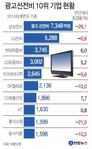 26일 재벌닷컴이 2014회계연도 감사보고서 상 광고선전비 상위 30개 기업을 조사한 결과 삼성전자의 광고선전비가 지난해 7348억원으로 1년 전 9943억원에서 26.1% 감소했다. 삼성전자가 광고선전비를 20% 이상 줄인 것은 개별 기준 영업이익이 지난해 14조원으로 1년 전보다 36.4% 줄어든 데 따른 것으로 분석된다.