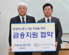 NH농협은행 전북본부(본부장 소성모)와 한국경영혁신중소기업 전북연합회(회장 김정태)는 지난 27일 메인비즈 전북연합회에서 ‘메인비즈 금융지원’업무협약을 체결했다.