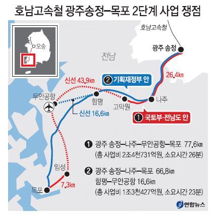 국토부·전남도는 신선과 무안공항 경유를 주장하고 있고 기재부는 사업비 절감 등을 이유로 기존선 활용과 무안공항 지선화를 주장하고 있다. 뉴스