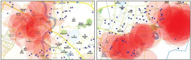 ▲ 전주(왼)·익산(오른)의 유독물사업장 위치와 해당 지역 학교를 표시한 지도. 유독물사업장을 중심으로 주변 1㎞까지 빨간색 원을 그린 뒤 파란색 점으로 학교를 표시했다. 빨간색 원이 겹치는 정도에 따라 점점 색이 짙어지게 표현했으며, 이 지역은 위험도가 더 높은 곳이다. 전북일보는 이 재난안전지도를 만들기 위해 1만개가 넘는 데이터를 분석했으며, 한 눈에 위험도를 알아볼 수 있도록 시각화했다. 지도 상단에 검색 기능을 만들어 보다 쉽게 학교의 위치를 찾을 수 있도록 했다. 그래픽=신재용 기자