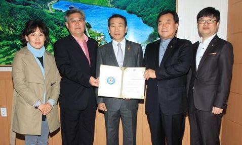 ▲ 민주평화통일 자문회의 정읍시협의회 임원진이 김생기 시장에게 서울장학숙 건립기금을 전한 뒤 기념촬영을 하고 있다. 사진제공=정읍시