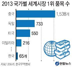 26일 코트라와 한국무역협회가 인용한 2013년 ‘유엔 상품 교역 통계(UN Commodity Trade Statistics)’에 따르면 중국의 세계시장 점유율 1위 품목은 1538개에 달했다. 2014년 자료는 아직 발표되지 않았다.