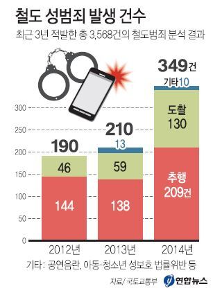 철도 성범죄 발생 건수는 2012년 190건, 2013년 210건, 2014년 349건으로 3년 새 84% 증가했다. 장소별로는 지하철, 시간대별로는 평일 아침 시간대(오전 6∼9시), 노선별로는 경부선이 가장 많았다.