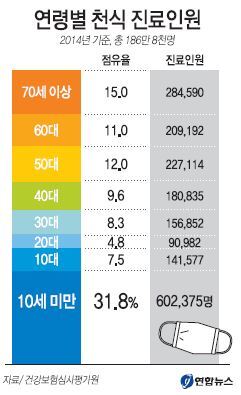 천식 진료 인원이 가장 많은 연령대는 10대 미만이었다. 이 연령대에서 2014년 60만2000명이 진료를 받아 전체의 31.8%를 차지했다.