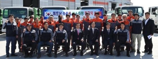 (주)카셈은 지난 27일 특장차를 베트남에 수출하기 위해 청소차 및 쓰레기차 등 10대를 선적한 후 지평선산단 자유무역지역 입주 후 첫 수출을 자축했다.
