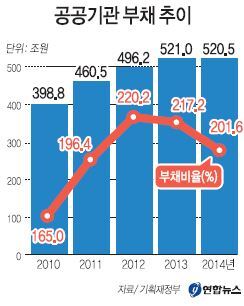 2011년 61조7000억원 증가한 공공기관 부채는 2012년 35조7000억원, 2013년 24조8000억원으로 증가 폭이 점차 줄어들다가 지난해 감소세로 전환했다. 자산매각, 영업이익 증가 등으로 자산 증가 속도가 빨라지면서 자기자본에서 부채가 차지하는 부채비율은 2013년보다 15.6%포인트 하락한 201.6%가 됐다.