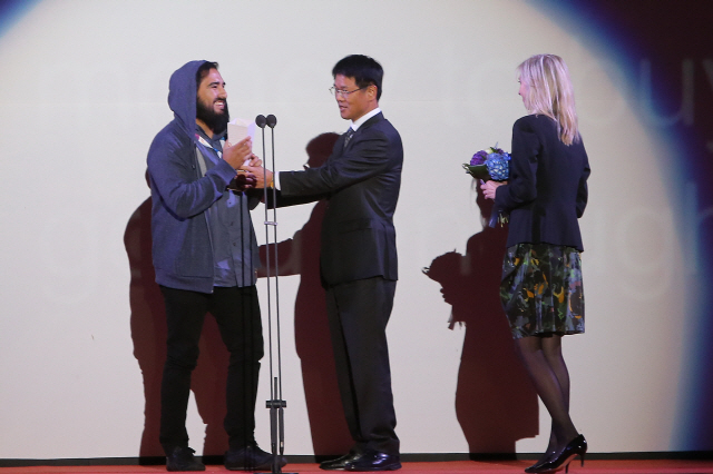 ▲ 국제경쟁에서 작품상인 우석상을 수여한 리카르도 실바 감독이 김응권 우석대 총장으로부터 상을 받고 있다. 추성수기자