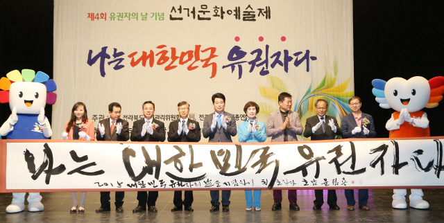 지난 9일 KBS전주방송총국 공개홀에서 전라북도선거관리위원회 주최로 열린 ‘제4회 유권자의 날’ 기념 선거문화예술제에 김성주 국회의원과 이재일 전북선관위 상임위원을 비롯한 참석자들이 ‘나는 대한민국 유권자이다’란 휘호 퍼포먼스를 갖고 있다.