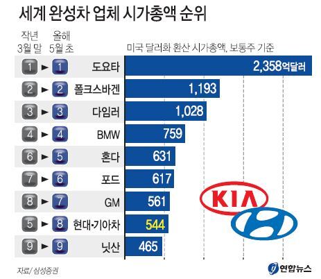 현대·기아차는 세계시장에서 급속도로 성장하며 2012년 한때 폴크스바겐을 제치고 시가총액 2위에 오르기도 했다. 뉴스