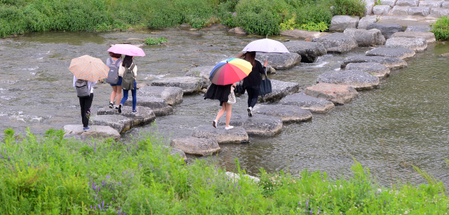 제6호 태풍 ‘노을(NOUL)’의 간접 영향을 받아 11일 오후부터 12일 오전 사이 도내 대부분 지역에 많은 비와 강한 바람이 예상되는 가운데 전주기전대 학생들이 전주천 징검다리를 건너 하교하고 있다.