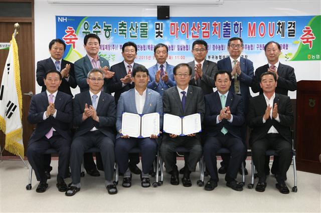 진안 마이산김치의 해외수출확대와 지역 우수농축산물의 판로확대를 위해 박민수 국회의원, CJ제일제당(주)와 부귀농협(조합장 정종옥)을 비롯한 진안군·장수군·무주군·임실군 관내 농협 무진장축산농협간에 양해각서(MOU) 체결식이 19일 진안 부귀농협 김치가공공장 2층회의실에서 개최되었다.