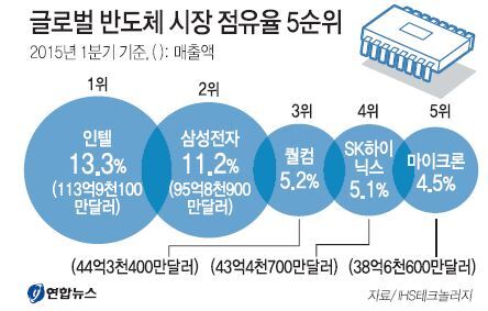 21일 시장조사기관 IHS테크놀로지의 글로벌 반도체 시장 점유율(매출기준) 자료에 따르면 올해 1분기 톱5 점유율은 인텔(미국) 13.3%, 삼성전자 11.2%, 퀄컴(미국)5.2%, SK하이닉스 5.1%, 마이크론(미국) 4.5% 순으로 집계됐다.