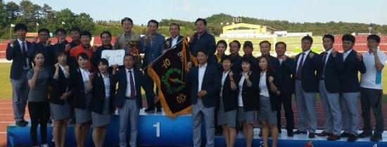 ▲ 김생기 정읍시장, 우천규 시의회의장, 이석문 정읍교육장, 최종필 정읍시생활체육회장과 정읍시체육회 임원들이 종합우승기와 우승컵을 들고 있다.
