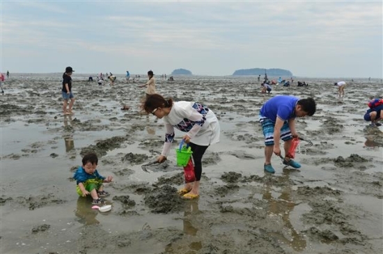 ▲ 고창 갯벌축제장을 찾은 가족들이 갯벌에서 바지락을 캐며 즐거운 시간을 보내고 있다.