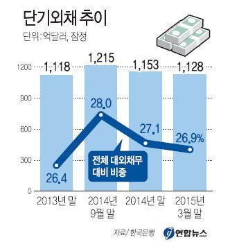 한국은행이 1일 발표한 ‘2015년 3월 말 국제투자대조표(잠정)’에 따르면 3월 말현재 대외채무 잔액(외국에서 빌린 돈)은 4189억 달러로 2014년 말 대비 65억 달러 줄었다. 이 가운데 단기외채는 1128억 달러로 전체 대외채무에서 차지하는 비중이 작년 말의 27.1%에서 26.9%로 소폭 낮아졌다. 대외채무는 만기 1년 이하는 단기, 1년 초과는 장기로 분류된다.
